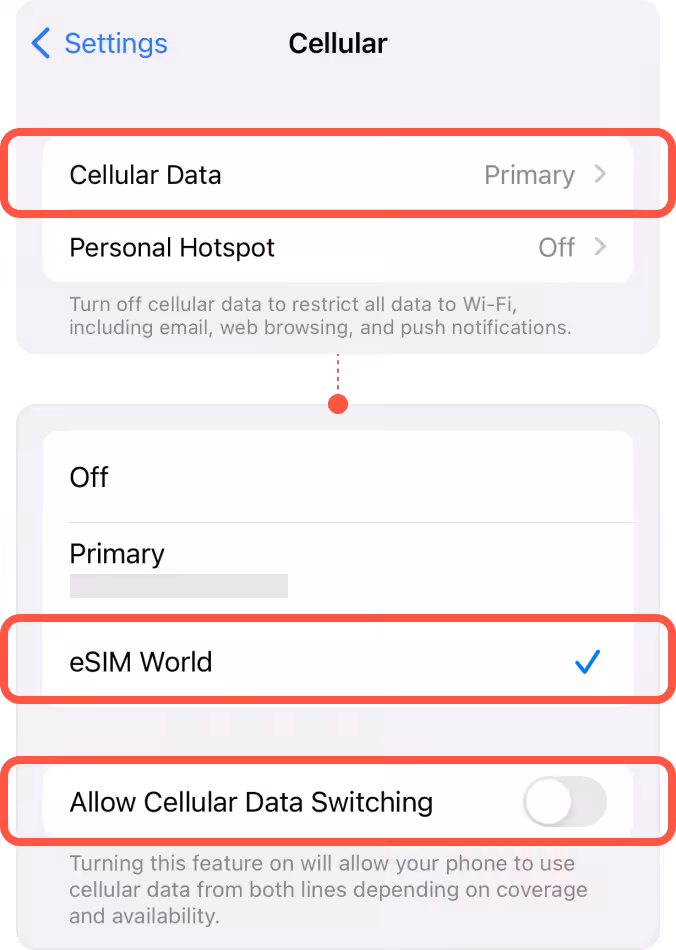Please toggle off ‘Allow Cellular Data Switching’ to prevent unnecessary roaming charges from your domestic carrier.