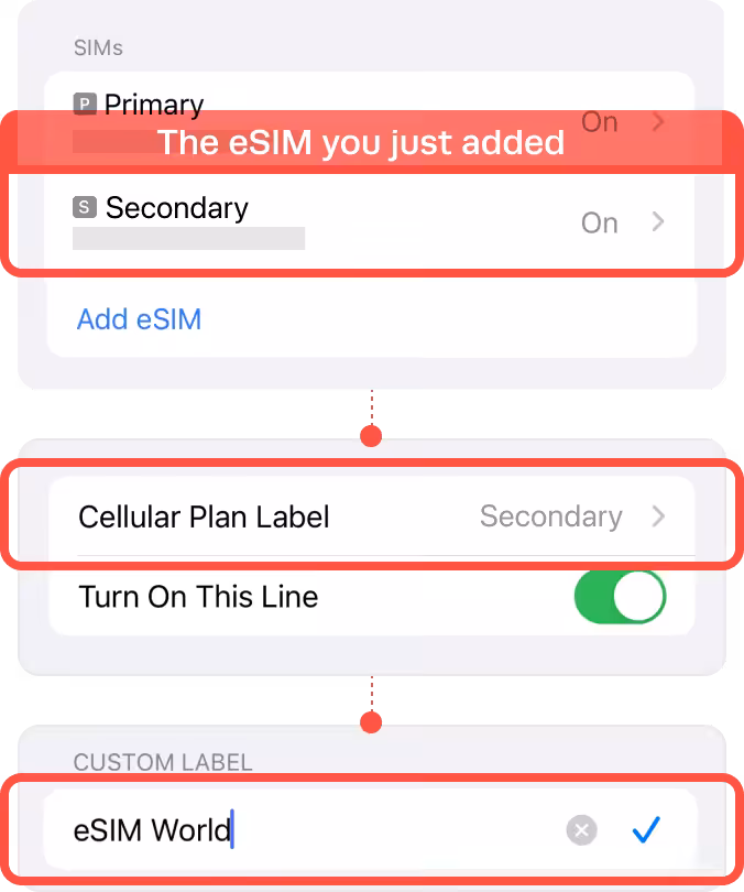 | ▸ | Tap [Cellular Plan Label] Type in the ‘Custom Label’, e.g. {Destination} – eSIM World. |